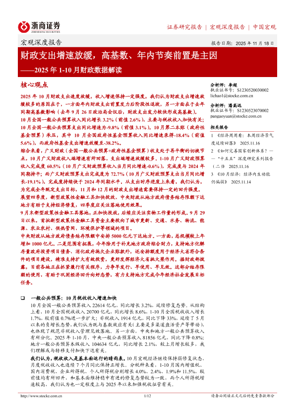 【浙商证券】【202511】财政支出增速放缓,高基数、年内节奏前置是主因——2025年1-10月财政数据解读-12页
