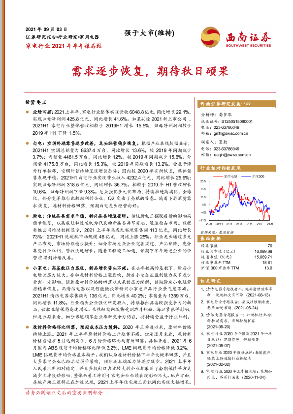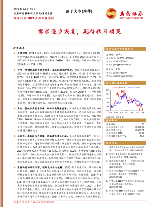 【西南证券】【20210903】家电行业2021年半年报总结:需求逐步恢复,期待秋日硕果-24页
