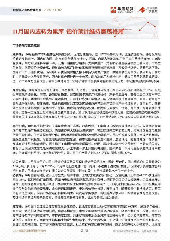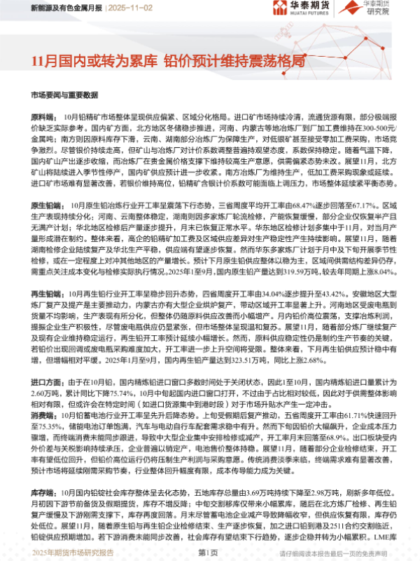【华泰期货】【202511】新能源及有色金属月报_11月国内或转为累库_铅价预计维持震荡格局-8页