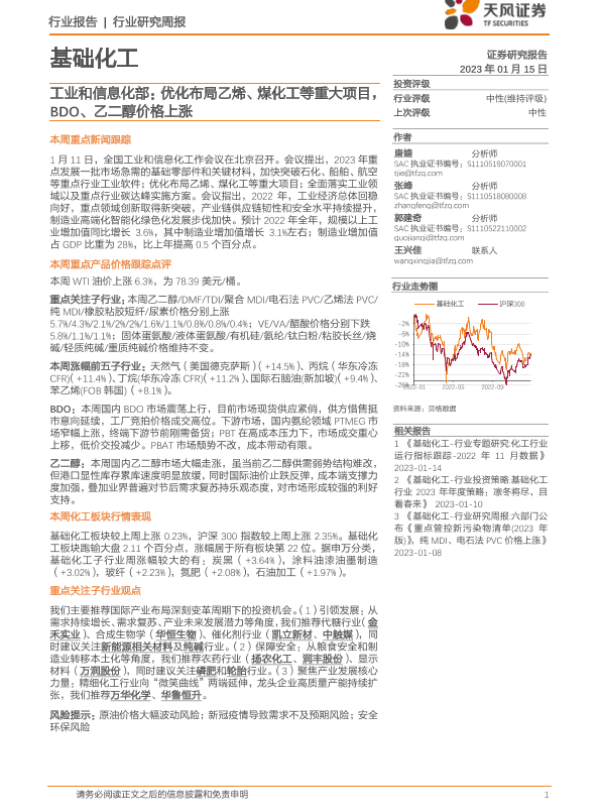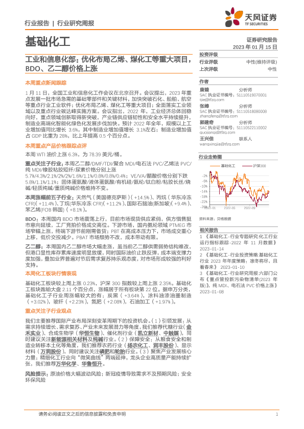 【天风证券】【20230115】基础化工行业研究周报:工业和信息化部:优化布局乙烯、煤化工等重大项目,BDO、乙二醇价格上涨-20页