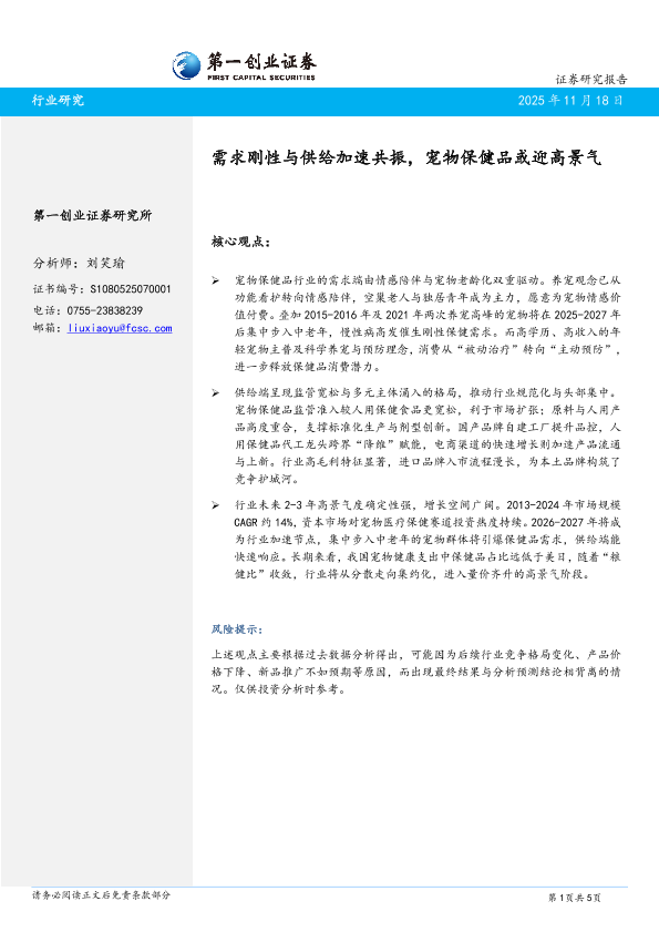 【第一创业证券】【202511】需求刚性与供给加速共振,宠物保健品或迎高景气-5页