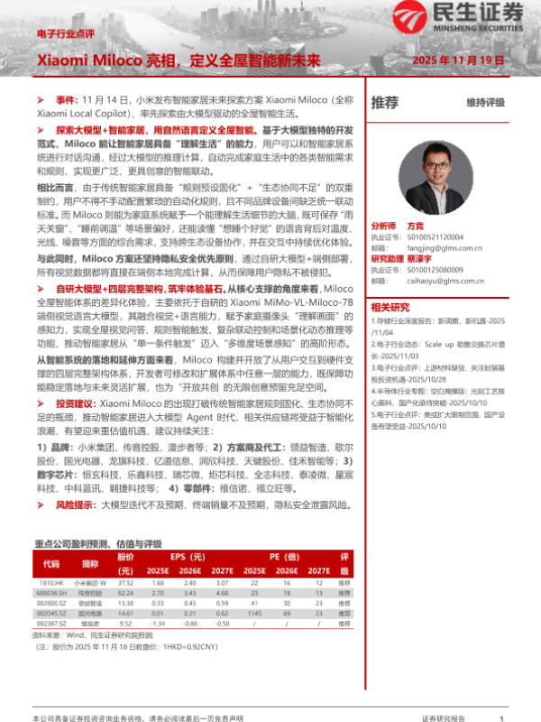 【民生证券】【202511】电子行业点评:Xiaomi Miloco亮相,定义全屋智能新未来-2页