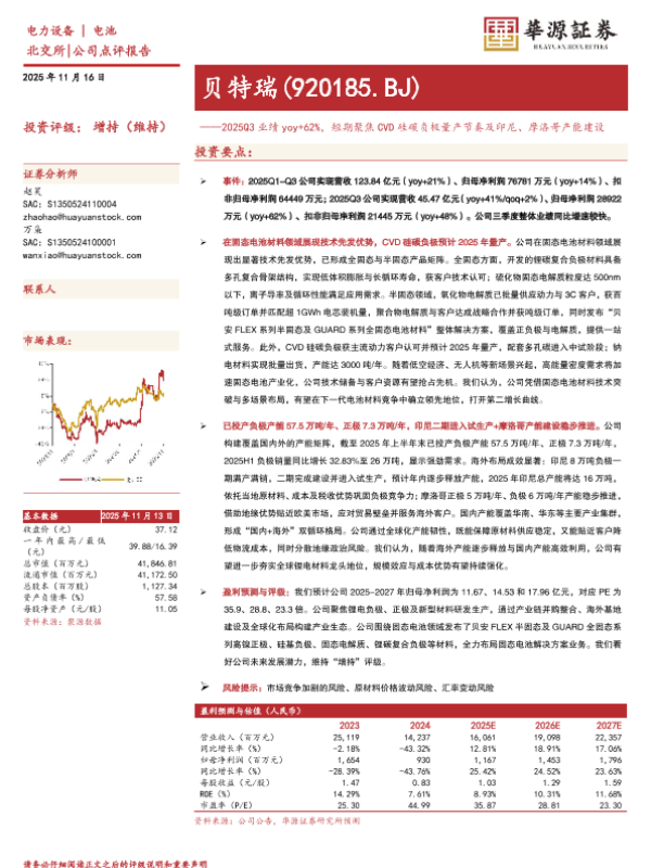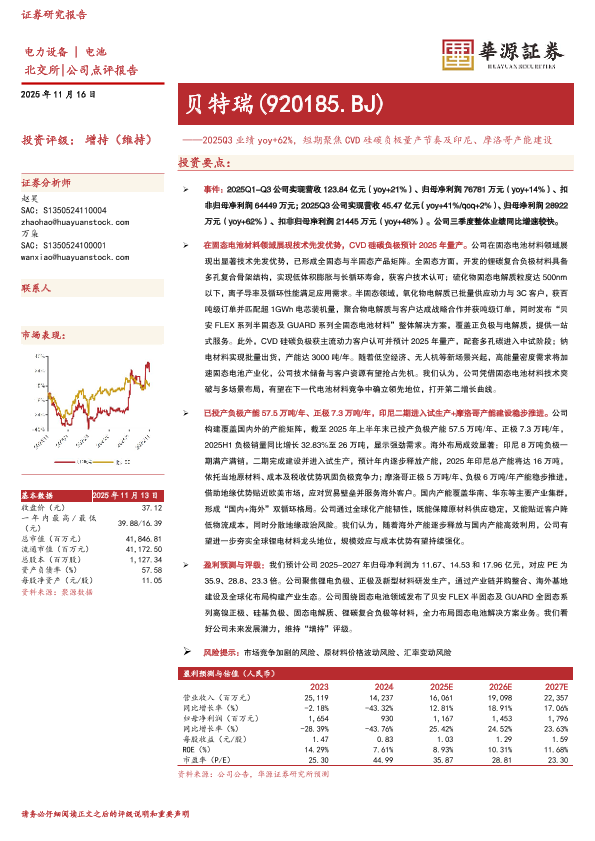 【华源证券】【202511】贝特瑞(920185.BJ)——2025Q3业绩 yoy+62%,短期聚焦 CVD硅碳负极量产节奏及印尼、摩洛哥产能建设-3页