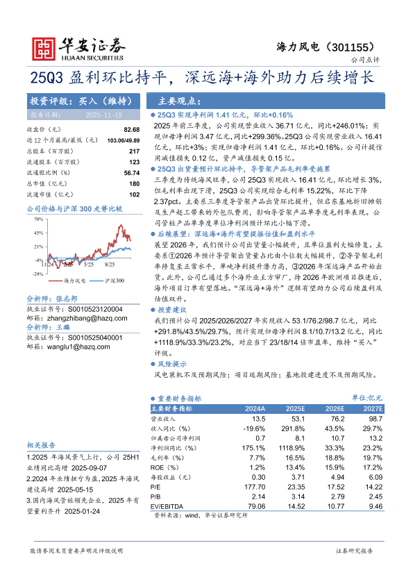盈利能力修复 海外市场拓展 深远海项目 投资评级买入 海风风电