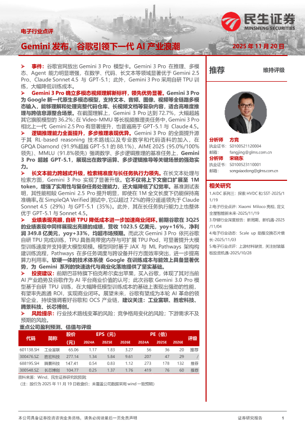 【民生证券】【202511】电子行业点评:Gemini发布,谷歌引领下一代AI产业浪潮-2页