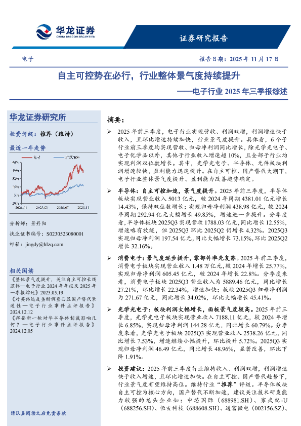 【华龙证券】【202511】电子行业2025年三季报综述:自主可控势在必行,行业整体景气度持续提升-22页
