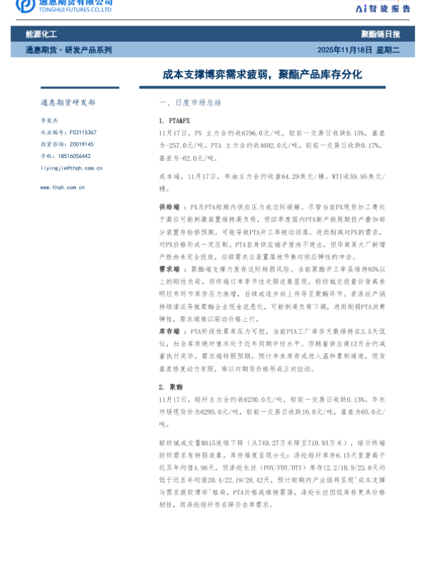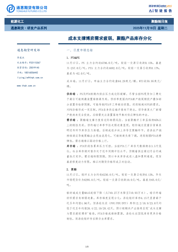 【通惠期货】【202511】成本支撑博弈需求疲弱,聚酯产品库存分化-9页