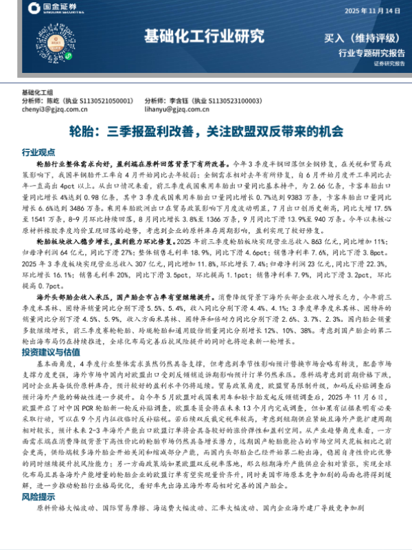 轮胎 盈利改善 出口 欧盟双反 三季报