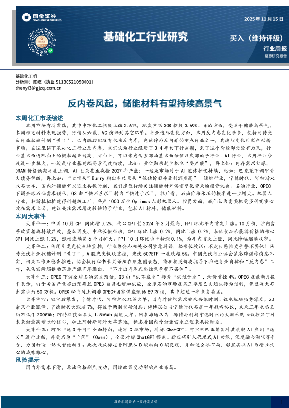 投资机会 储能材料 反内卷 基础化工 行业周报