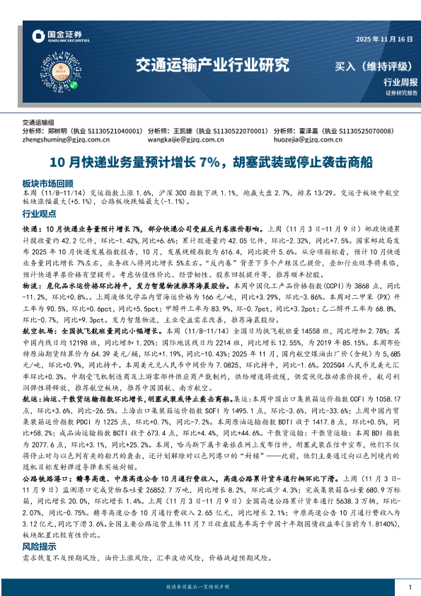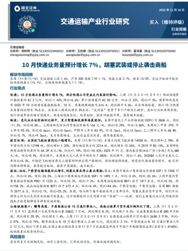 【国金证券】【202511】2025-11-16_国金证券_交通运输产业行业研究:10月快递业务量预计增长7%,胡塞武装或停止袭击商船-17页