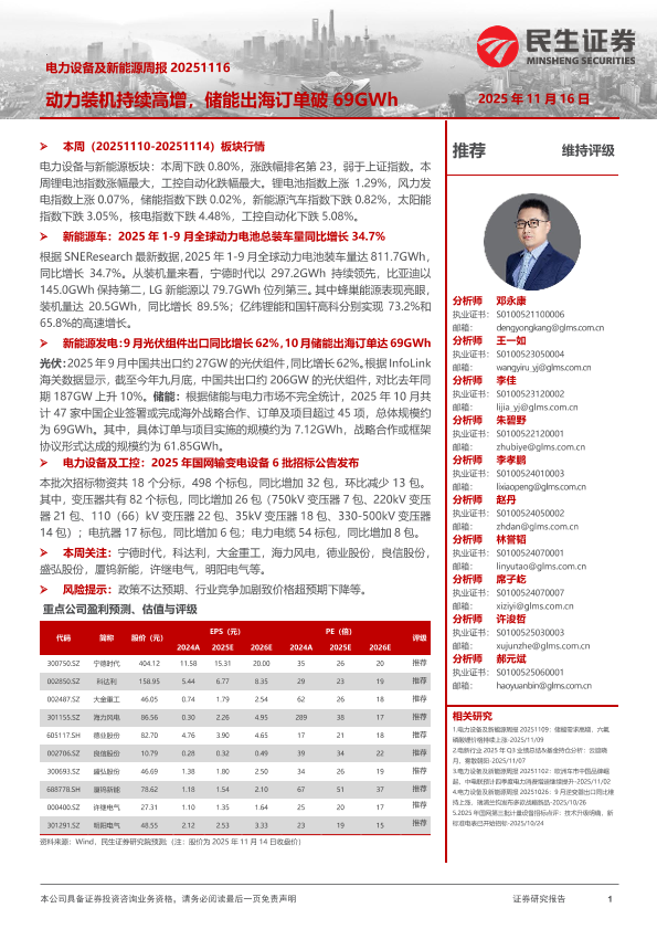 【民生证券】【202511】电力设备及新能源周报 20251116 动力装机持续高增,储能出海订单破 69GWh-23页