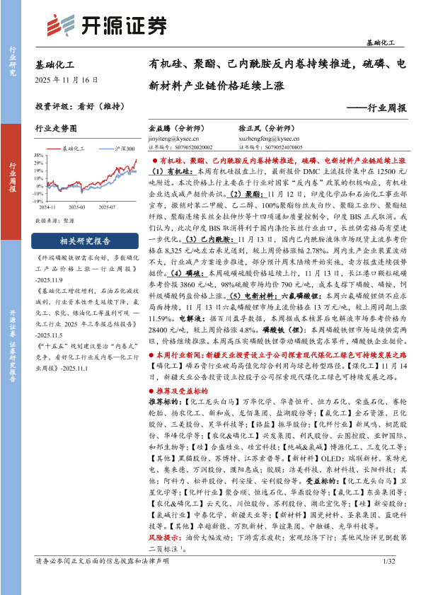 【开源证券】【202511】基础化工行业周报:有机硅、聚酯、己内酰胺反内卷持续推进,硫磷、电新材料产业链价格延续上涨-32页