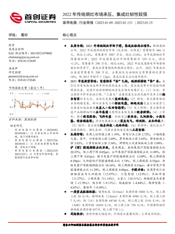 【首创证券】【20230115】家用电器行业周报:2022年传统烟灶市场承压,集成灶韧性较强-18页