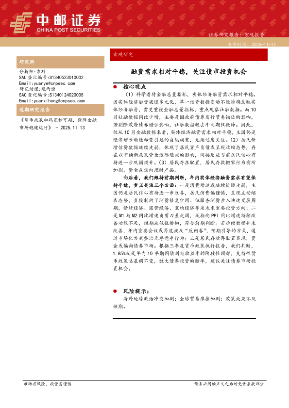 【中邮证券】【202511】融资需求相对平稳,关注债市投资机会-9页