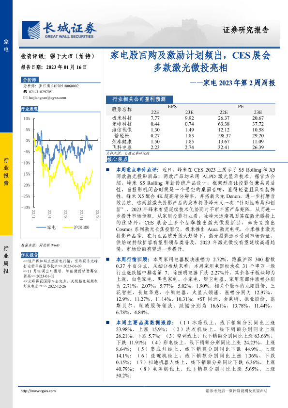 【长城证券】【20230116】家电2023年第2周周报:家电股回购及激励计划频出,CES展会多款激光微投亮相-30页