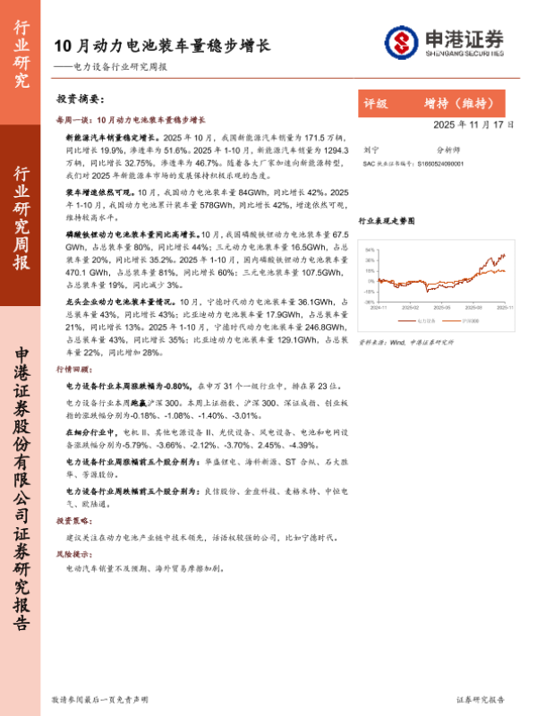 【申港证券】【202511】10月动力电池装车量稳步增长——电力设备行业研究周报-10页