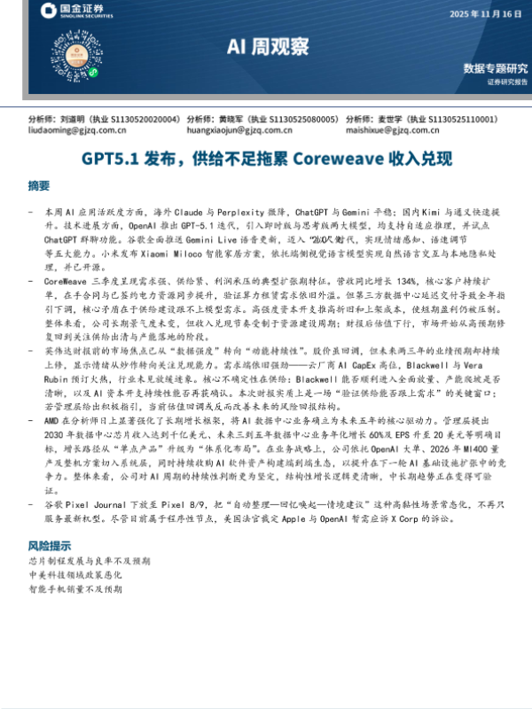 【国金证券】【202511】AI周观察:GPT5.1发布,供给不足拖累Coreweave收入兑现-9页