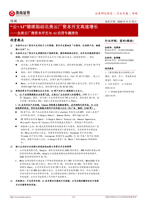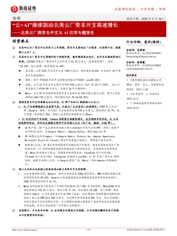【浙商证券】【202511】“云+AI”继续驱动北美云厂资本开支高速增长——北美云厂商资本开支与 AI应用专题报告-12页