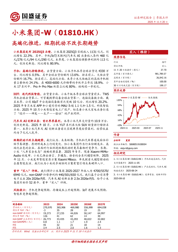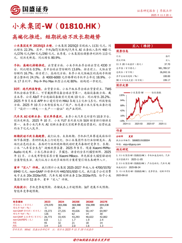 投资评级 汽车业务 财报分析 高端化 小米集团
