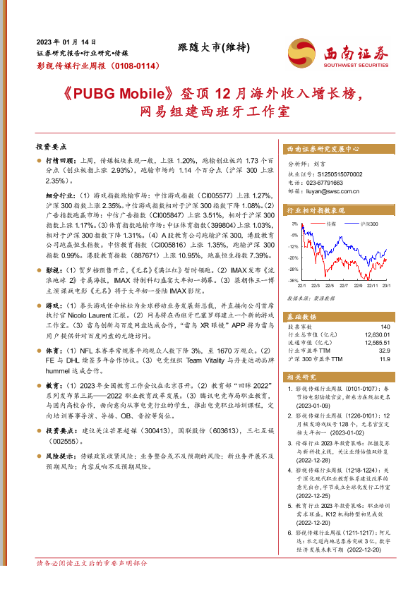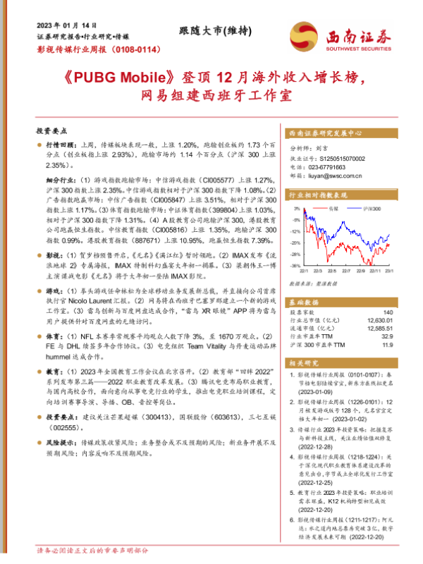 【西南证券】【20230114】影视传媒行业周报:《PUBG Mobile》登顶12月海外收入增长榜,网易组建西班牙工作室-19页