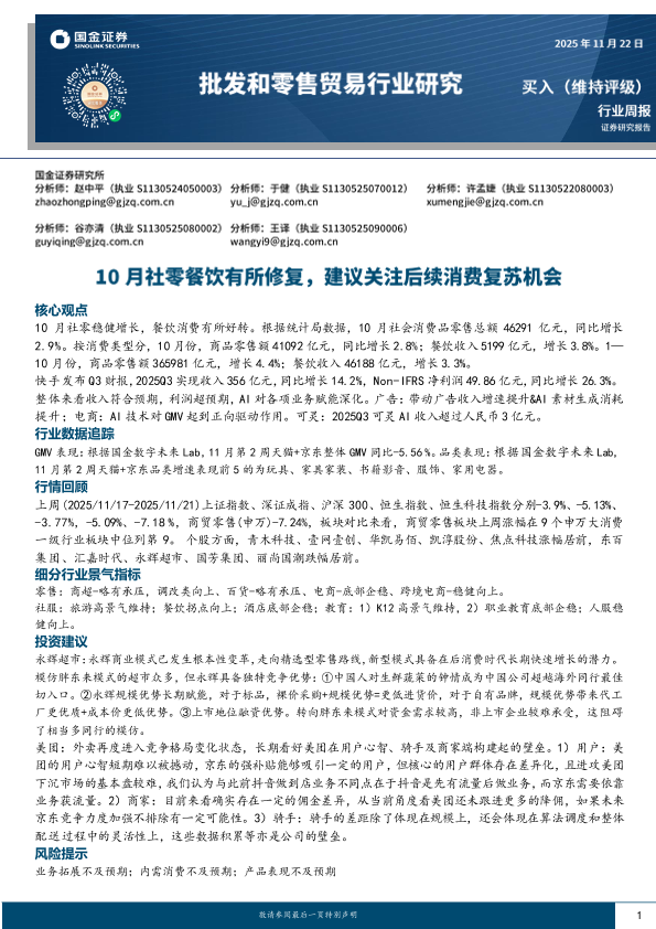 【国金证券】【202511】批发和零售贸易行业周报:10月社零餐饮有所修复,建议关注后续消费复苏机会-8页
