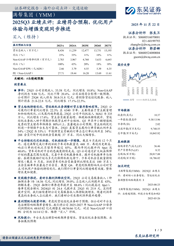 用户体验优化 业绩符合预期 货运经纪业务 盈利能力提升 变现能力增强