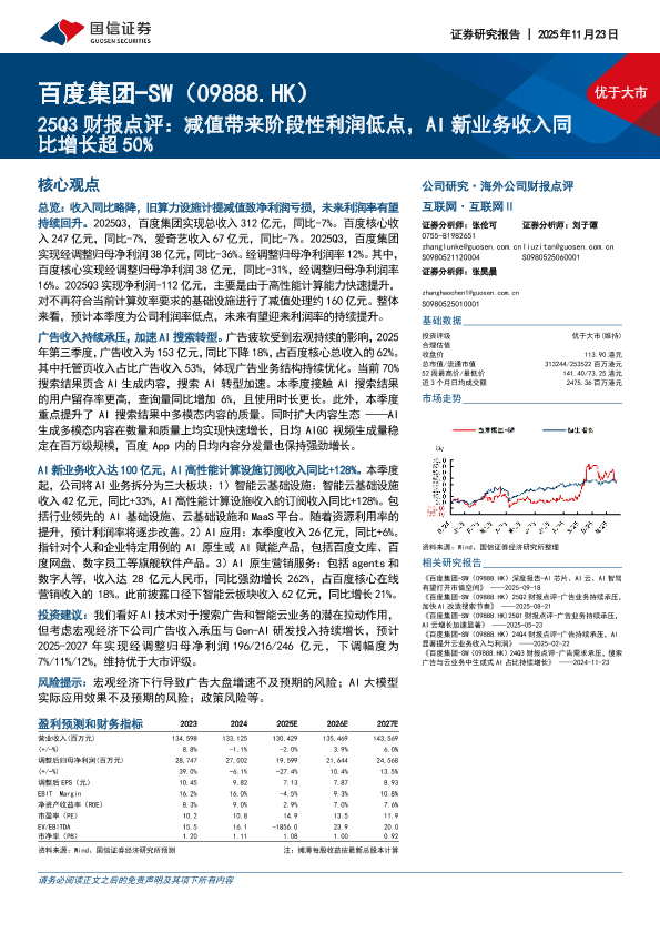 AI新业务 百度集团 减值损失 搜索转型 智能云