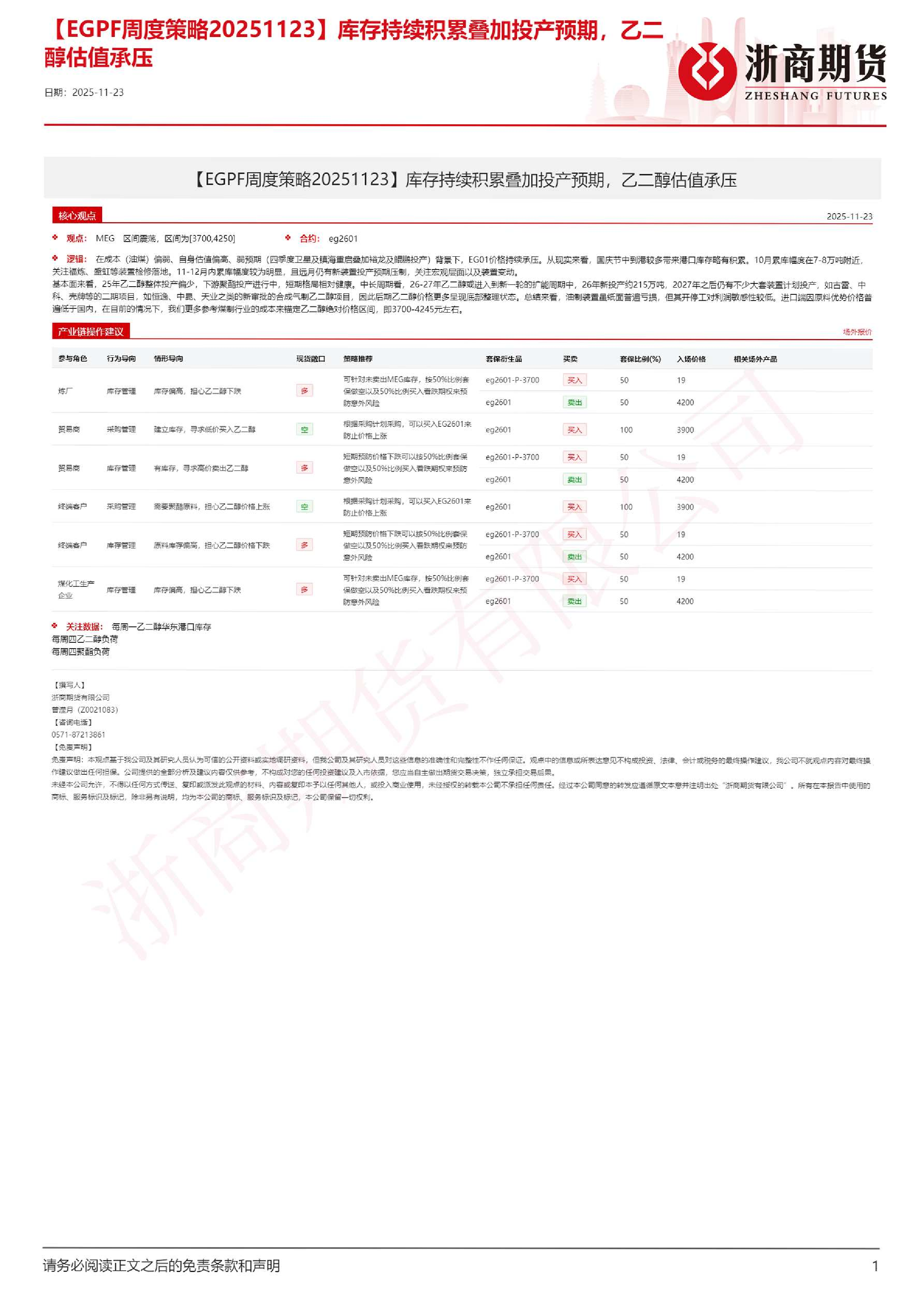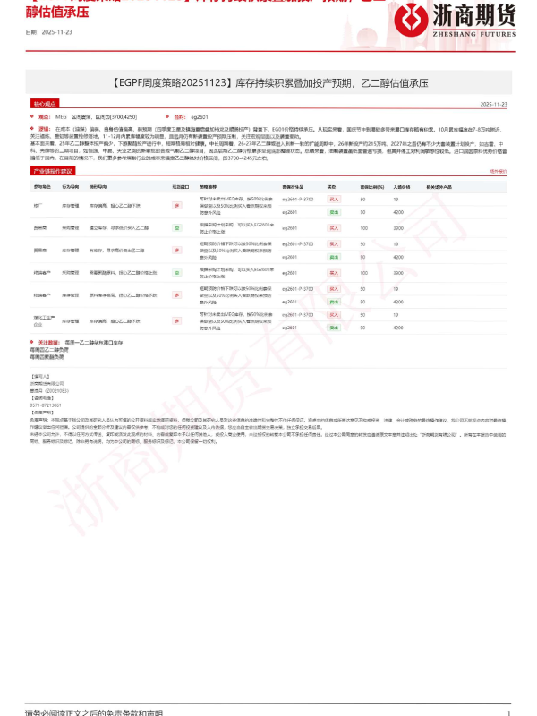 【浙商期货】【202511】EGPF周度策略 20251123 库存持续积累叠加投产预期 乙二醇估值承压-9页