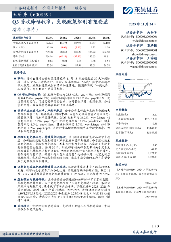 投资评级 零售业 免税政策 王府井 Q3业绩