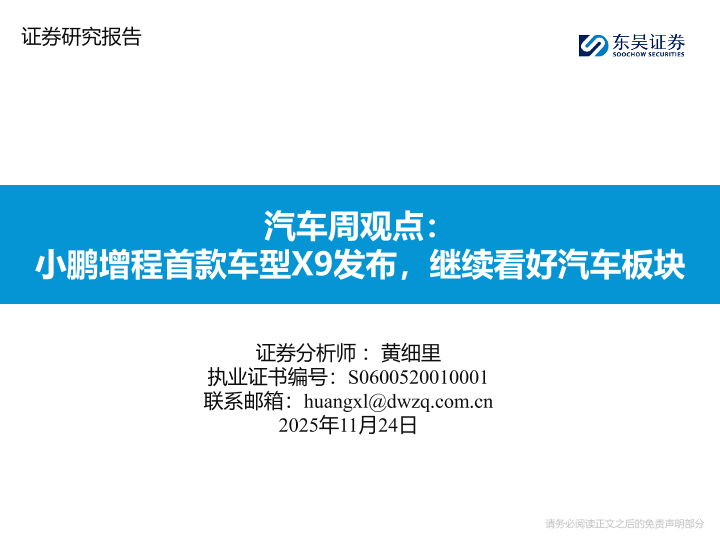 【东吴证券】【202511】汽车周观点: 小鹏增程首款车型X9发布,继续看好汽车板块-25页