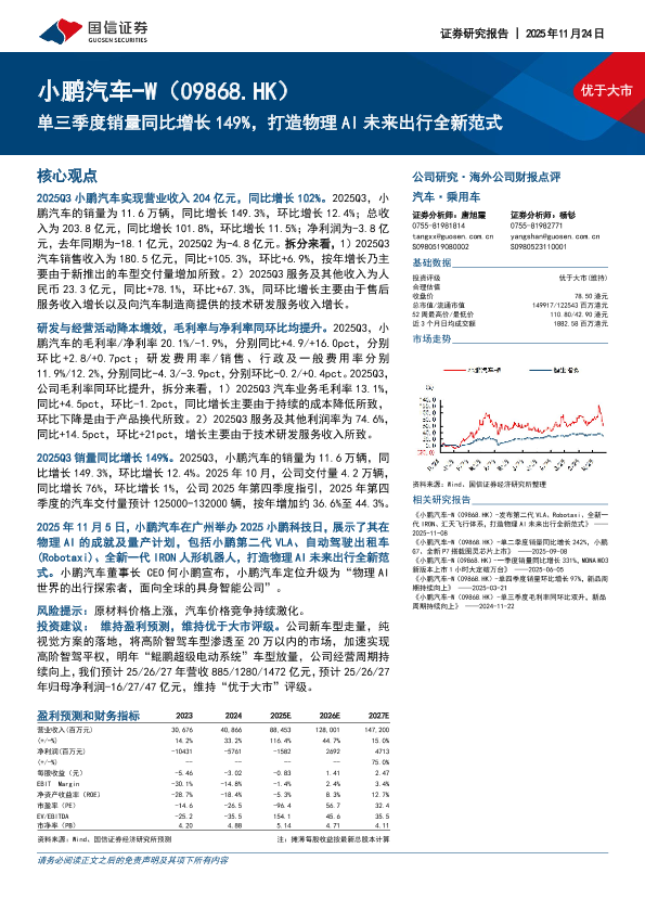 【国信证券】【202511】优于大市 小鹏汽车-W(09868.HK)单三季度销量同比增长 149%,打造物理 A I未来出行全新范式-13页