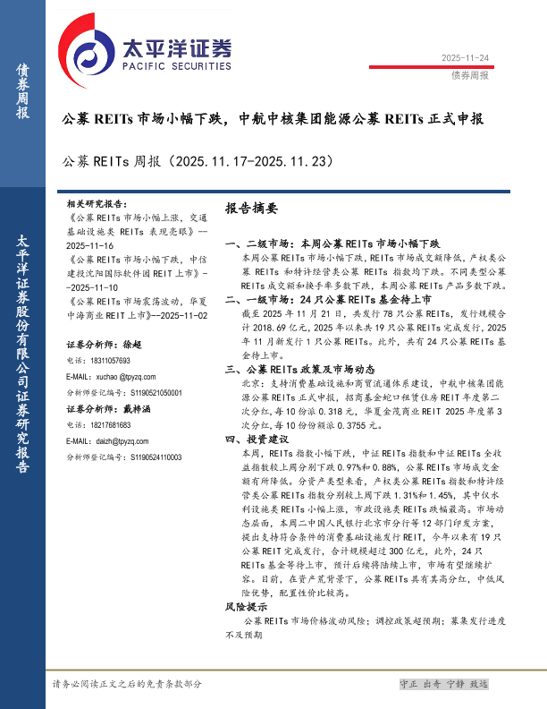 【太平洋证券】【202511】公募 REITs市场小幅下跌,中航中核集团能源公募 REITs正式申报-16页