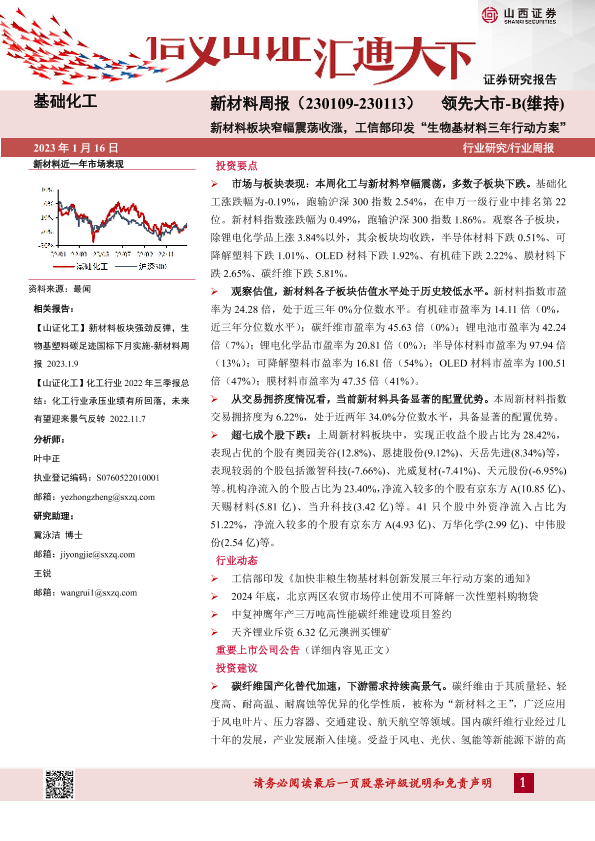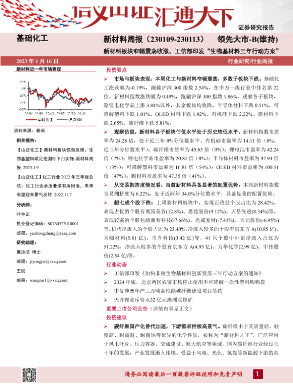 【山西证券】【20230116】新材料行业周报:新材料板块窄幅震荡收涨,工信部印发“生物基材料三年行动方案”-25页