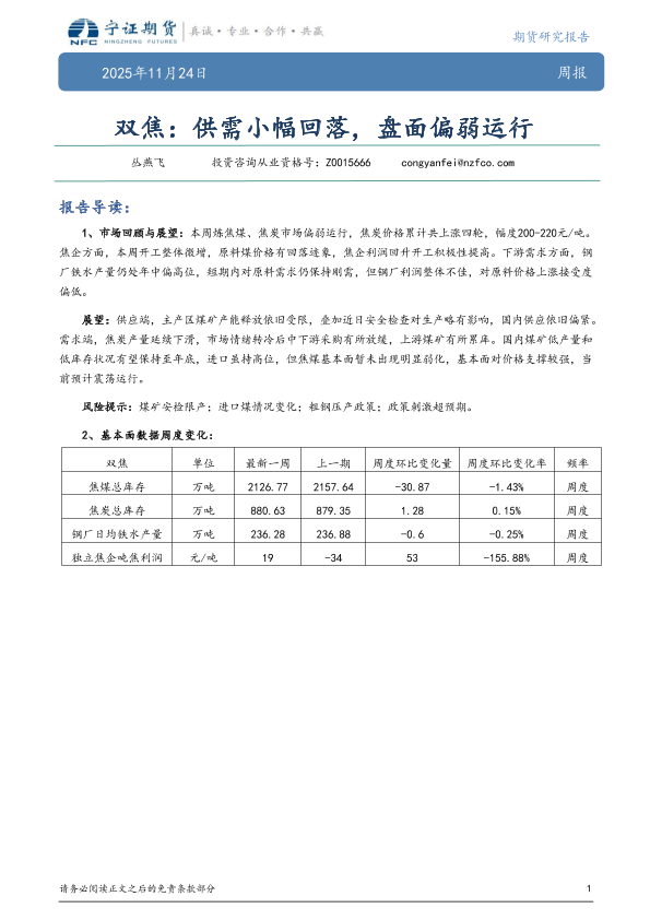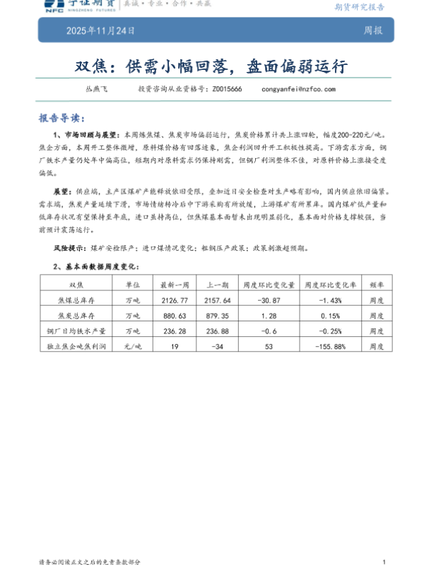 【宁证期货有限公司】【202511】双焦:供需小幅回落,盘面偏弱运行-5页