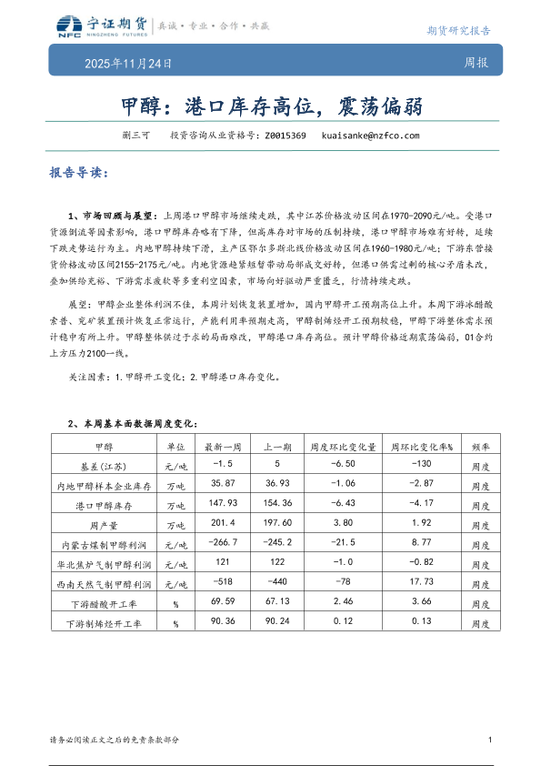 【宁证期货】【202511】甲醇:港口库存高位,震荡偏弱-5页