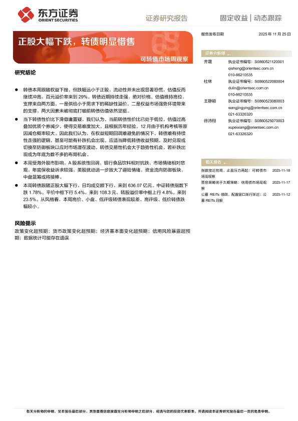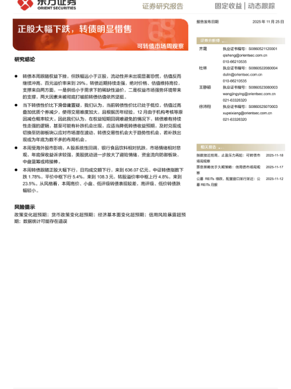 【东方证券】【202511】可转债市场周观察:正股大幅下跌,转债明显惜售-10页
