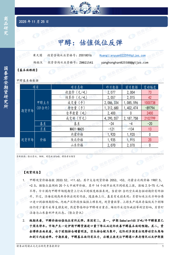 【国泰君安期货】【202511】多甲醇:估值低位反弹-3页