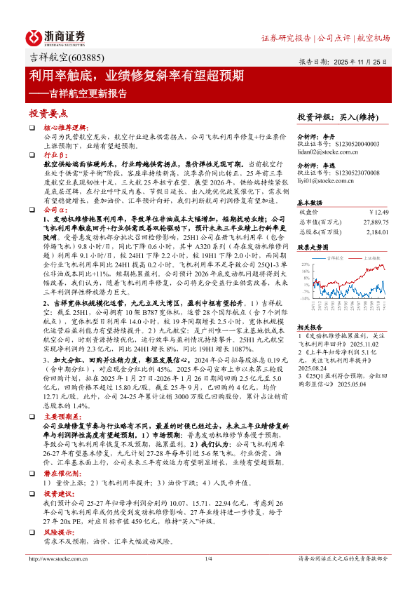 【浙商证券】【202511】利用率触底,业绩修复斜率有望超预期——吉祥航空更新报告-4页