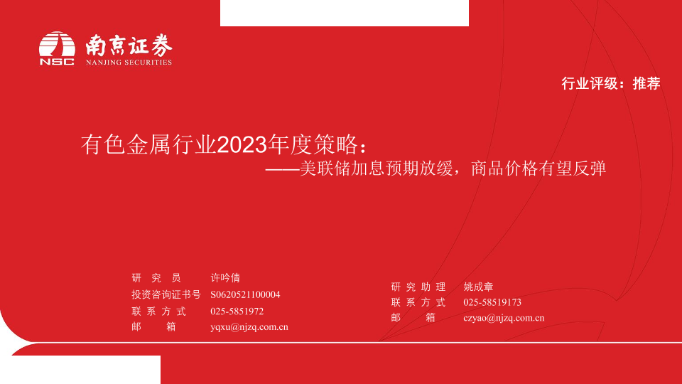【南京证券】【20230116】有色金属行业2023年度策略:美联储加息预期放缓,商品价格有望反弹-26页