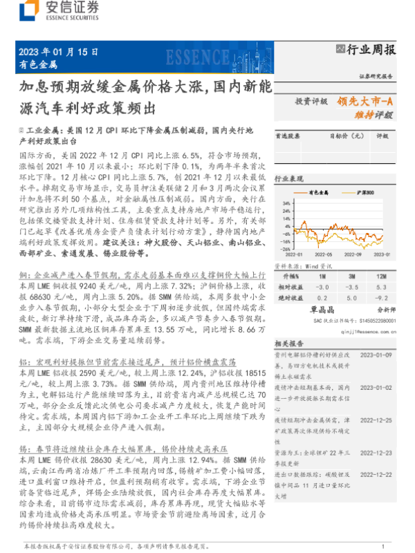 【安信证券】【20230115】有色金属行业周报:加息预期放缓金属价格大涨,国内新能源汽车利好政策频出-19页