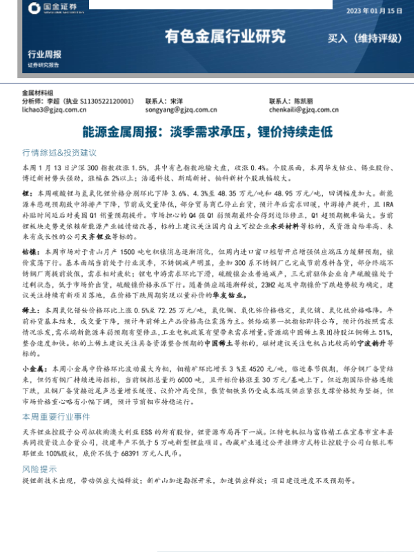 【国金证券】【20230115】有色金属行业研究周报:能源金属周报,淡季需求承压,锂价持续走低-15页