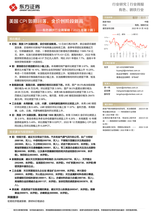 【东方证券】【20230116】有色钢铁行业周策略(2023年第2周):美国CPI如期回落,金价创阶段新高-40页