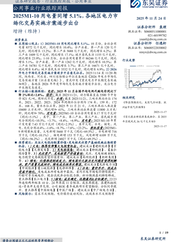 【东吴证券】【202511】2025M1-10用电量同增5.1%,各地区电力市场化交易实施方案逐步出台-19页