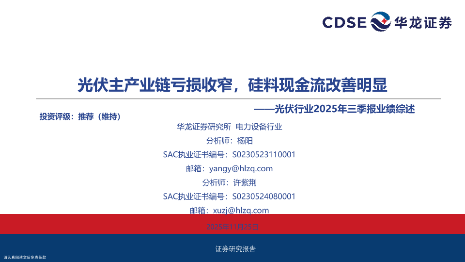 【华龙证券】【202511】光伏行业2025年三季报业绩综述:光伏主产业链亏损收窄,硅料现金流改善明显-20页