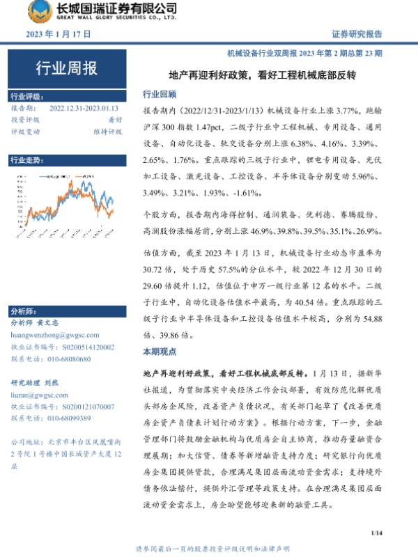 【长城国瑞证券】【20230117】机械设备行业双周报2023年第2期总第23期:地产再迎利好政策,看好工程机械底部反转-14页