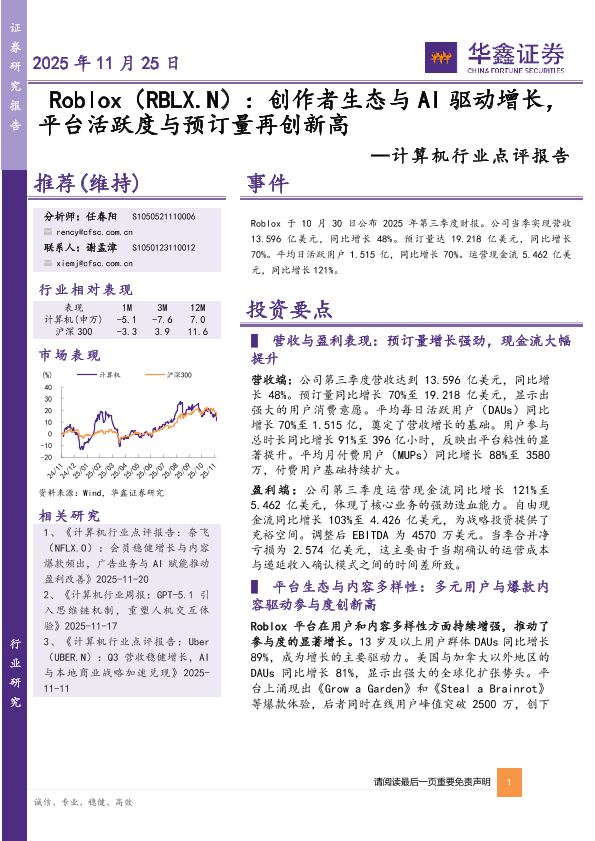 【华鑫证券】【202511】Rob lox(RBLX.N):创作者生态与 A I驱动增长, 平台活跃度与预订量再创新高-5页