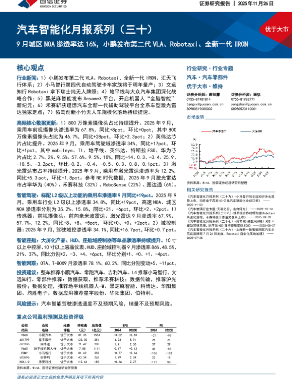 【国信证券】【202511】汽车智能化月报系列(三十):9月城区NOA渗透率达16%,小鹏发布第二代VLA、Robotaxi、全新一代IRON-63页