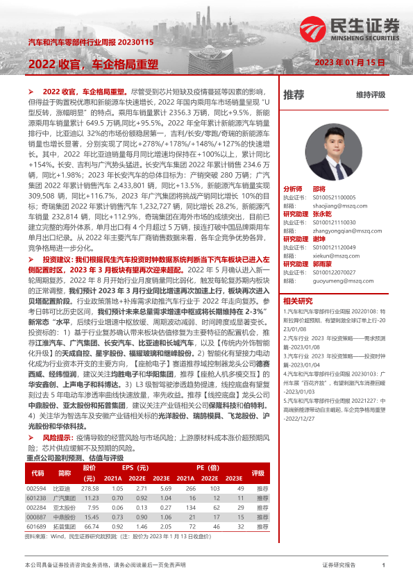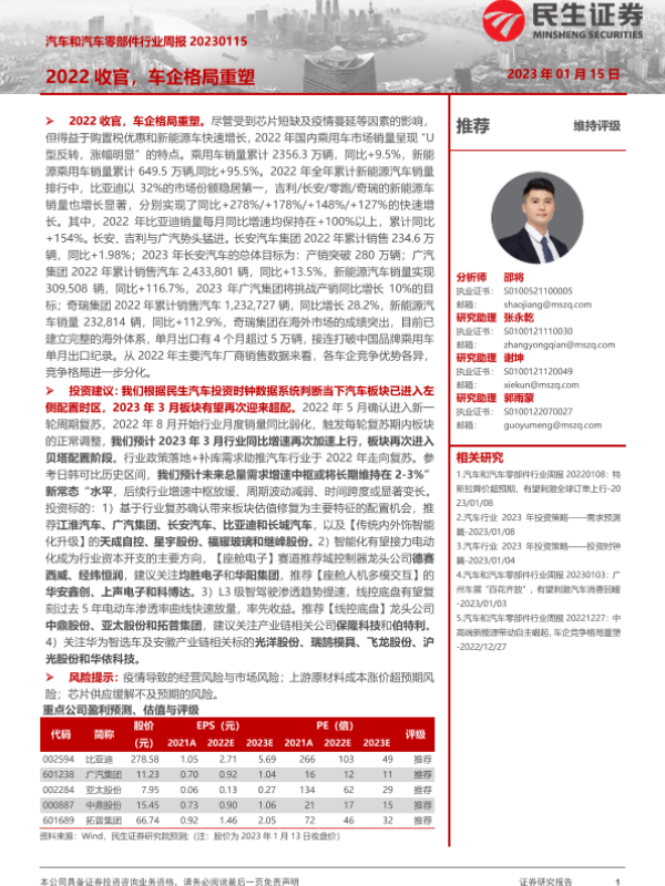 【民生证券】【20230115】汽车和汽车零部件行业周报:2022收官,车企格局重塑-19页