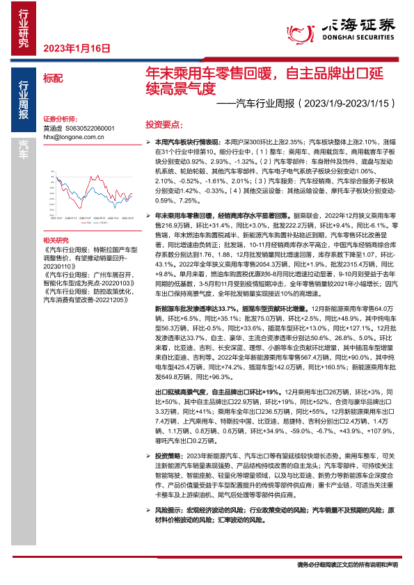 【东海证券】【20230116】汽车行业周报:年末乘用车零售回暖,自主品牌出口延续高景气度-17页