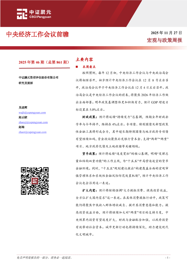 【中证鹏元资信评估股份有限公司研究发展部】【202511】2025年第46期(总第861期):中央经济工作会议前瞻-12页